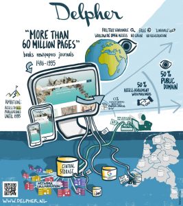 The beautifully designed poster describes how Delpher gives access through a single platform to millions of pages from newspapers, books, journals and news bulletins from university libraries, museums and heritage institutions.