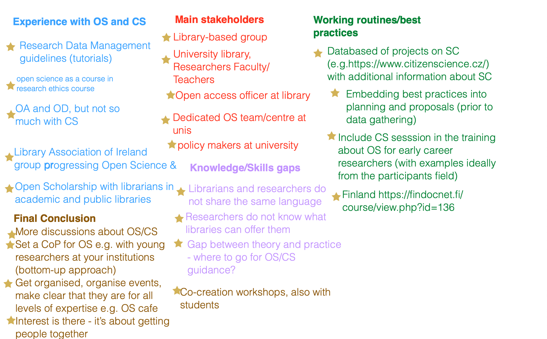 After Dirk’s presentation, participants were split into 6 groups where they discussed their experience with Open and Citizen Science, working routines and best practices, main stakeholders involved in Open and Citizen Science projects, the roles of libraries and universities in bringing such project to life, as well as any knowledge or skills gaps that might prevent effective Open and Citizen Science implementation at Universities/Libraries.