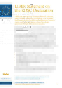 LIBER, the Association of European Research Libraries, supports Open Science for contributing to an increased dissemination, reproducibility and application of research results, and to the acceleration of new knowledge generation through data-driven innovation.